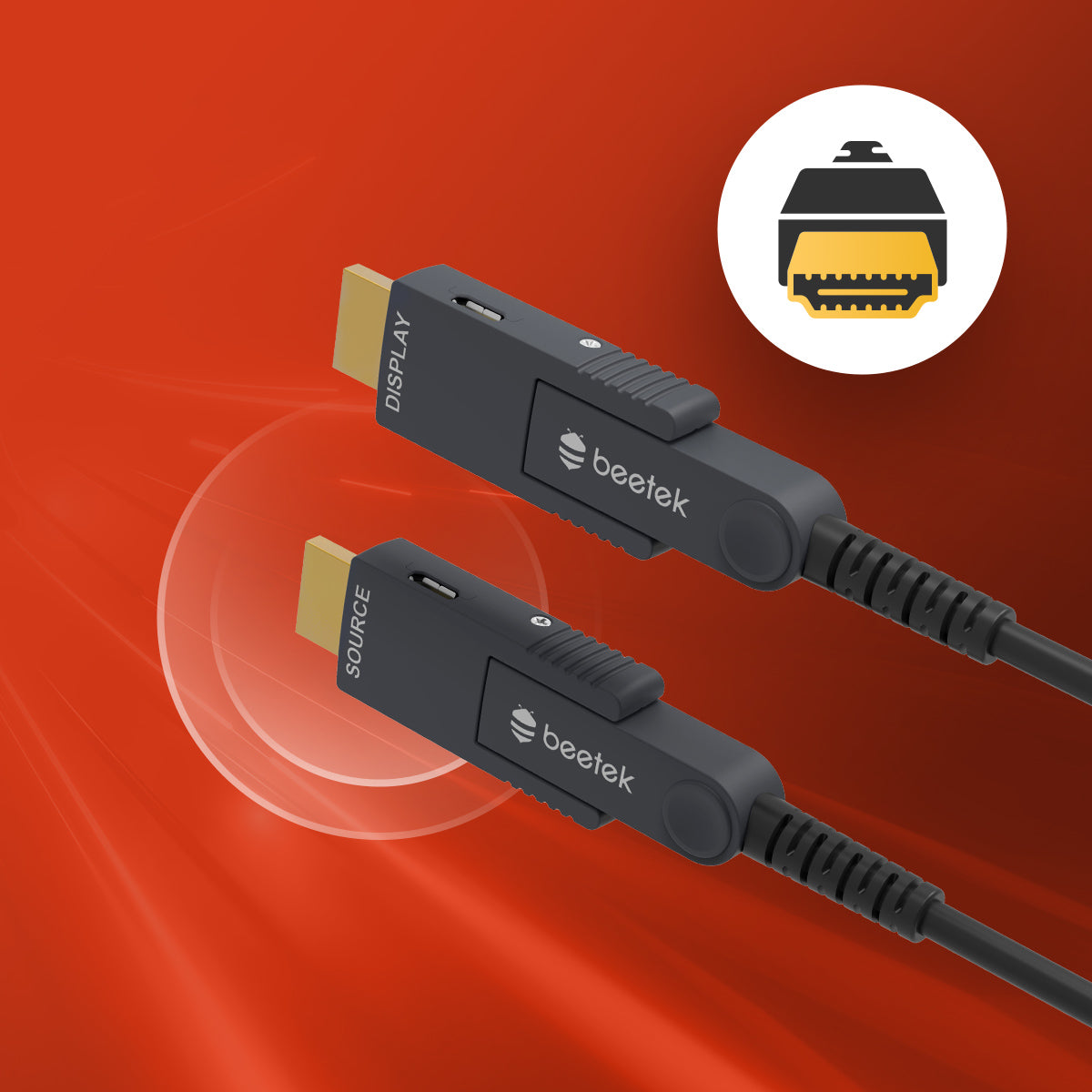 Beetek Photo electric Hybrid Non Threading cable supports HDMI 2.0 signals at 4K@60 4:4:4 at 18 Gbps. The ADD 4K series products are designed for long distance HDMI signal transmission via fibre optic technology, OM3 fibre optic transmission with embedded optic engine technology achieves no delay and no compression.