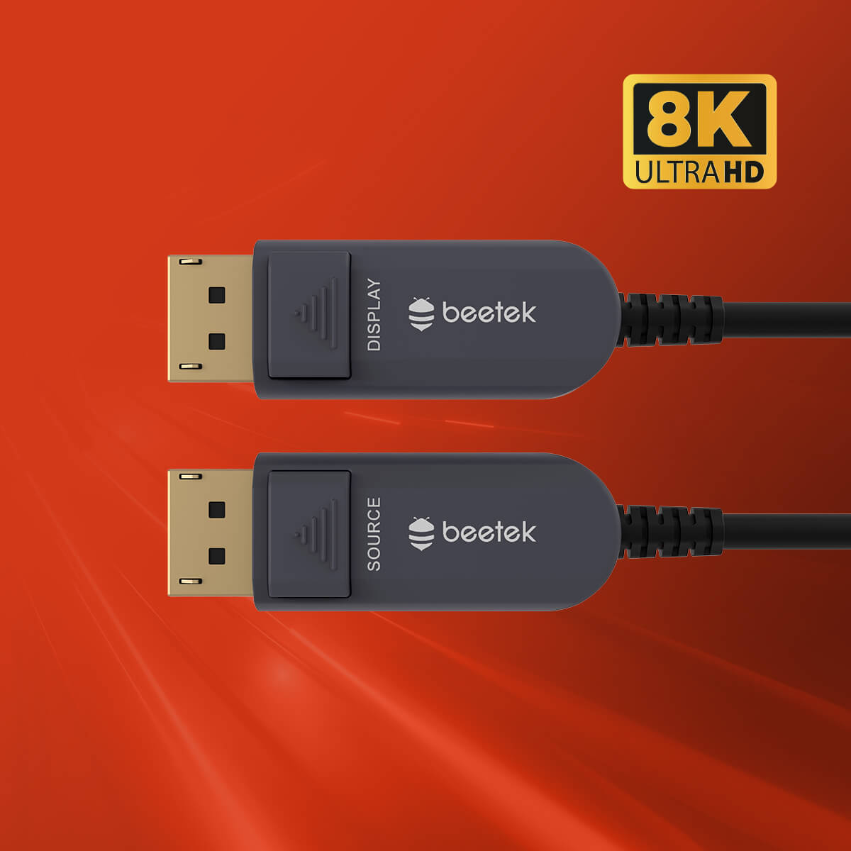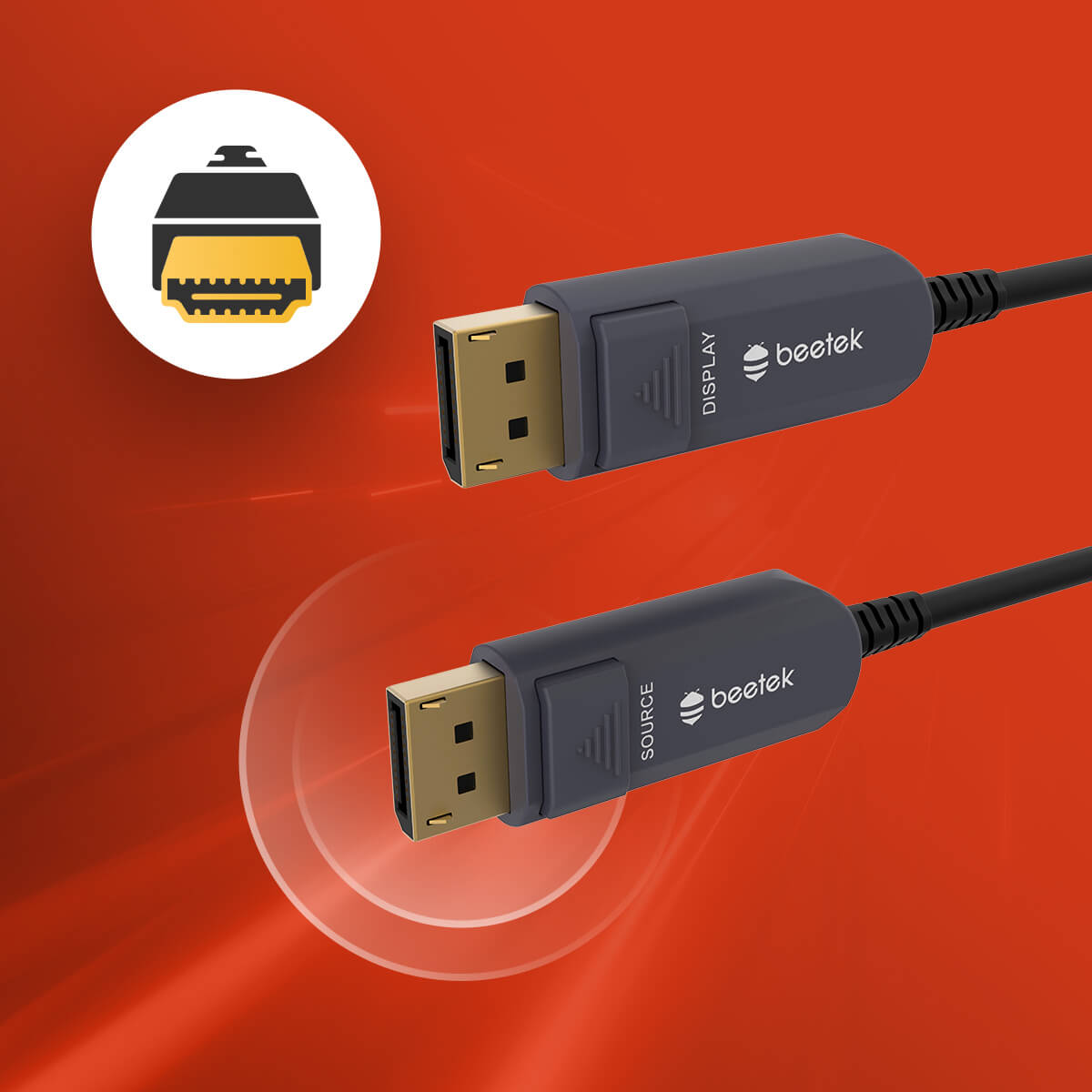 Beetek Photo electric Hybrid Non Threading cable supports Display Port signals at 8K@60 4:4:4 at 32.4 Gbps.The ADP 8K series products are designed for long distance DP signal transmission via fibre optic technology, OM3 fibre optic transmission with embedded optic engine technology achieves no delay and no compression. Transparent EDID passthrough from source to sink The product is suitable for Rental, Live Events, Residential and surveillance applications
