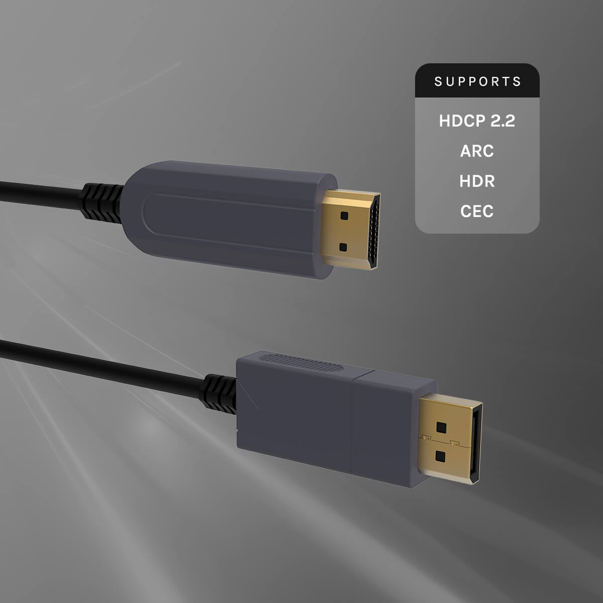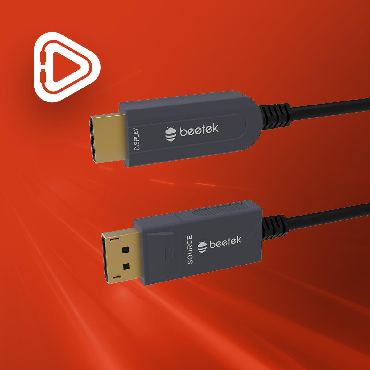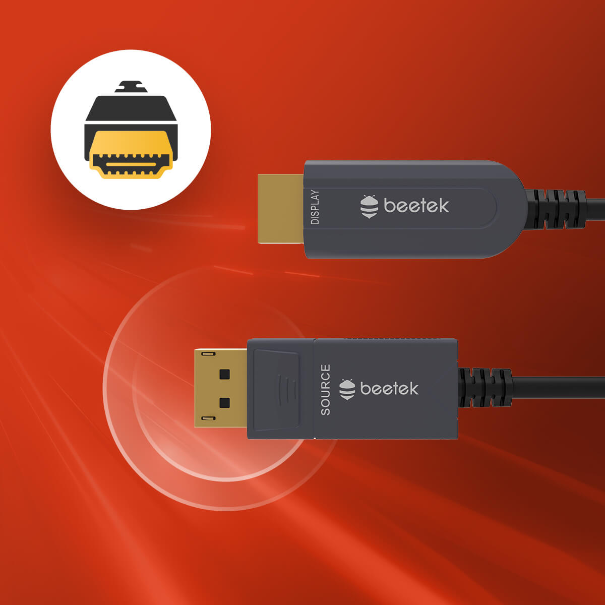 Beetek DP to HDMI Photo electric Hybrid Single End Threading cable supports signals 4K@60 4:4:4 18 Gbps. The ADHP 4K series products are designed for long distance signal transmission via fibre optic technology, OM3 fibre optic transmission with embedded optic engine technology achieves no delay and no compression. The cable has a removable DP Connector on both end for easy wiring and Transparent EDID passthrough from source to sink and the cable be configured by changing the connector to DP-DP or DP=Mini DP . The product is suitable for Rental, Live Events, Residential and surveillance applications