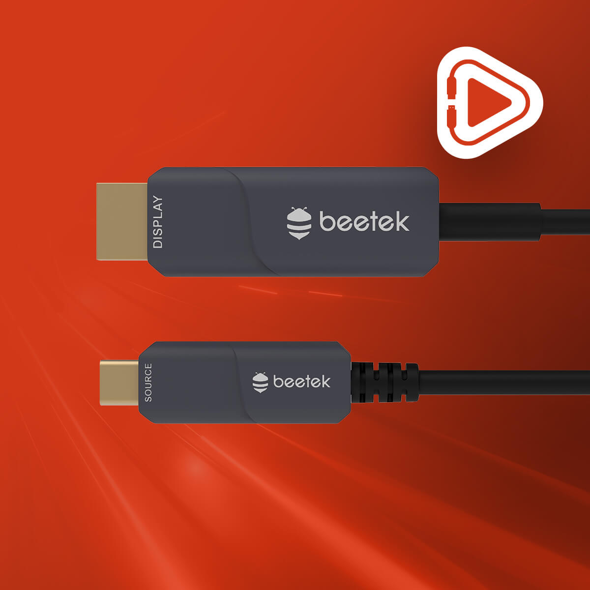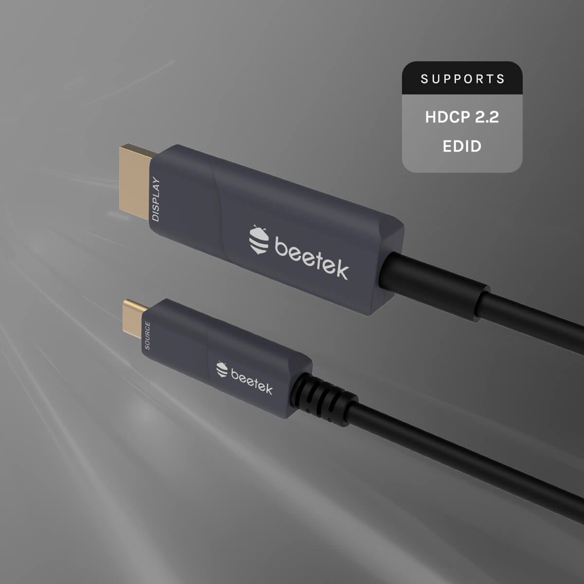 Beetek DVI Photo electric Hybrid Single End Threading cable supports signals 4K@60 4:4:4 18 Gbps. he AUSBCH 4K series products are designed for long distance signal transmission via fibre optic technology, OM3 fibre optic transmission with embedded optic engine technology achieves no delay and no compression. USB-C to HDMI enables USB-C laptop for video sharing communication and and Transparent EDID passthrough from source to sink. The product is suitable for Rental, Live Events, Residential and surveillance applications