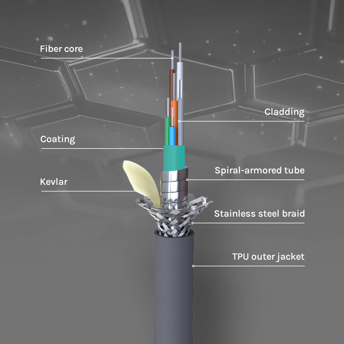 | Structural Layers | Fiber core + Cladding + Coating + Spiral-armored tube + Kevlar + Aluminium braid + TPU outer jacket |