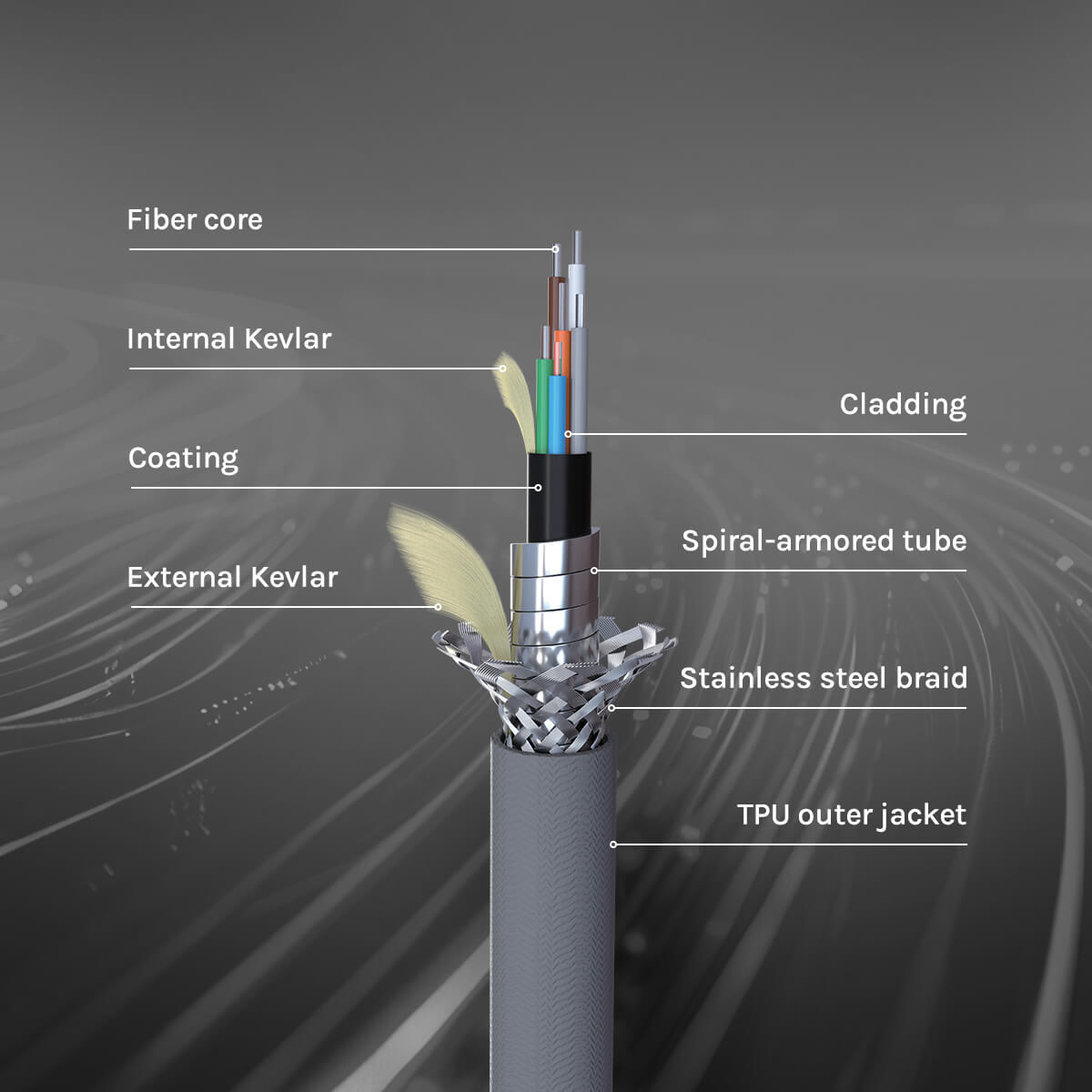 | Structural Layers | Fiber core + Cladding + Internal Kevlar + Coating + Spiral-armored tube + External Kevlar + Stainless steel braid + TPU outer jacket |