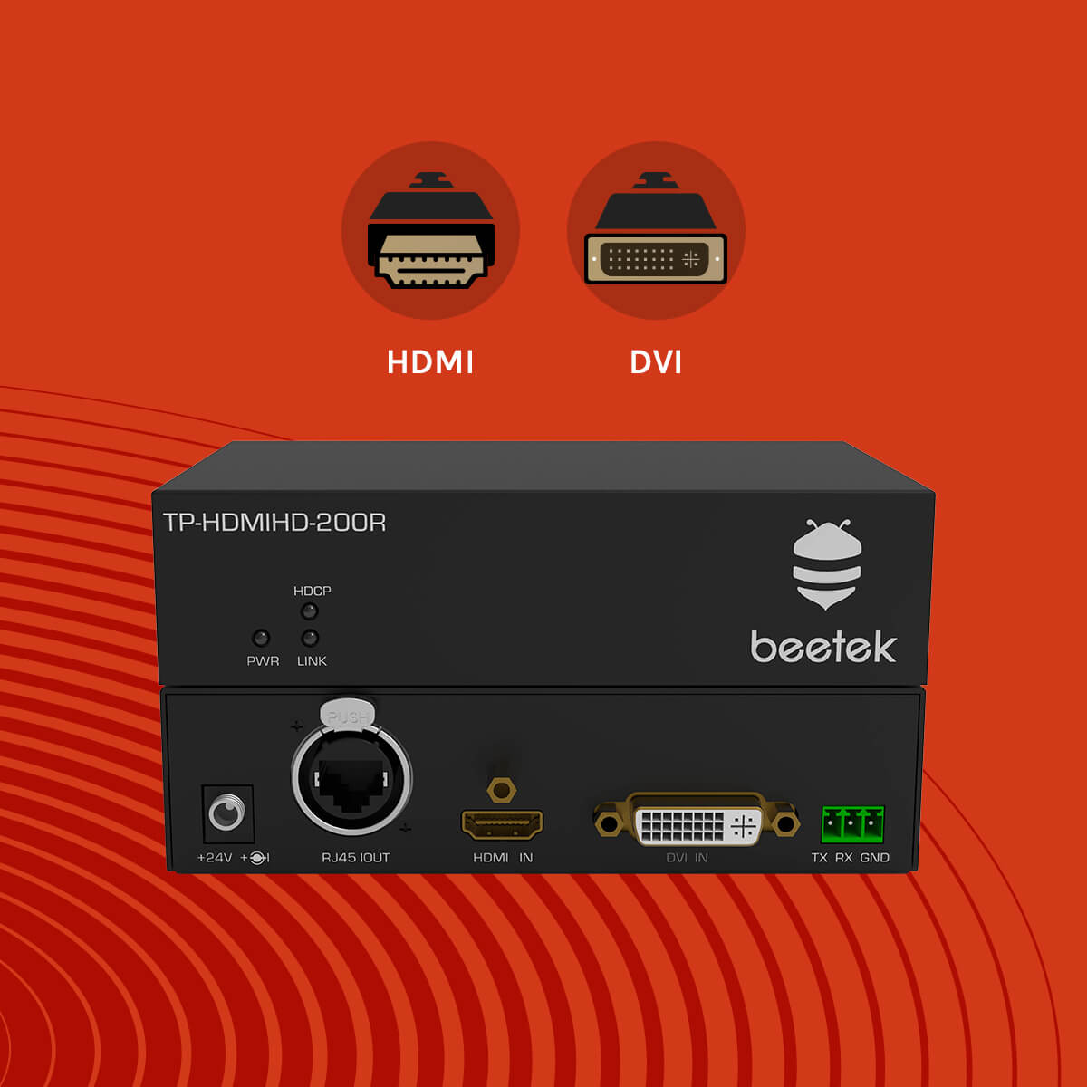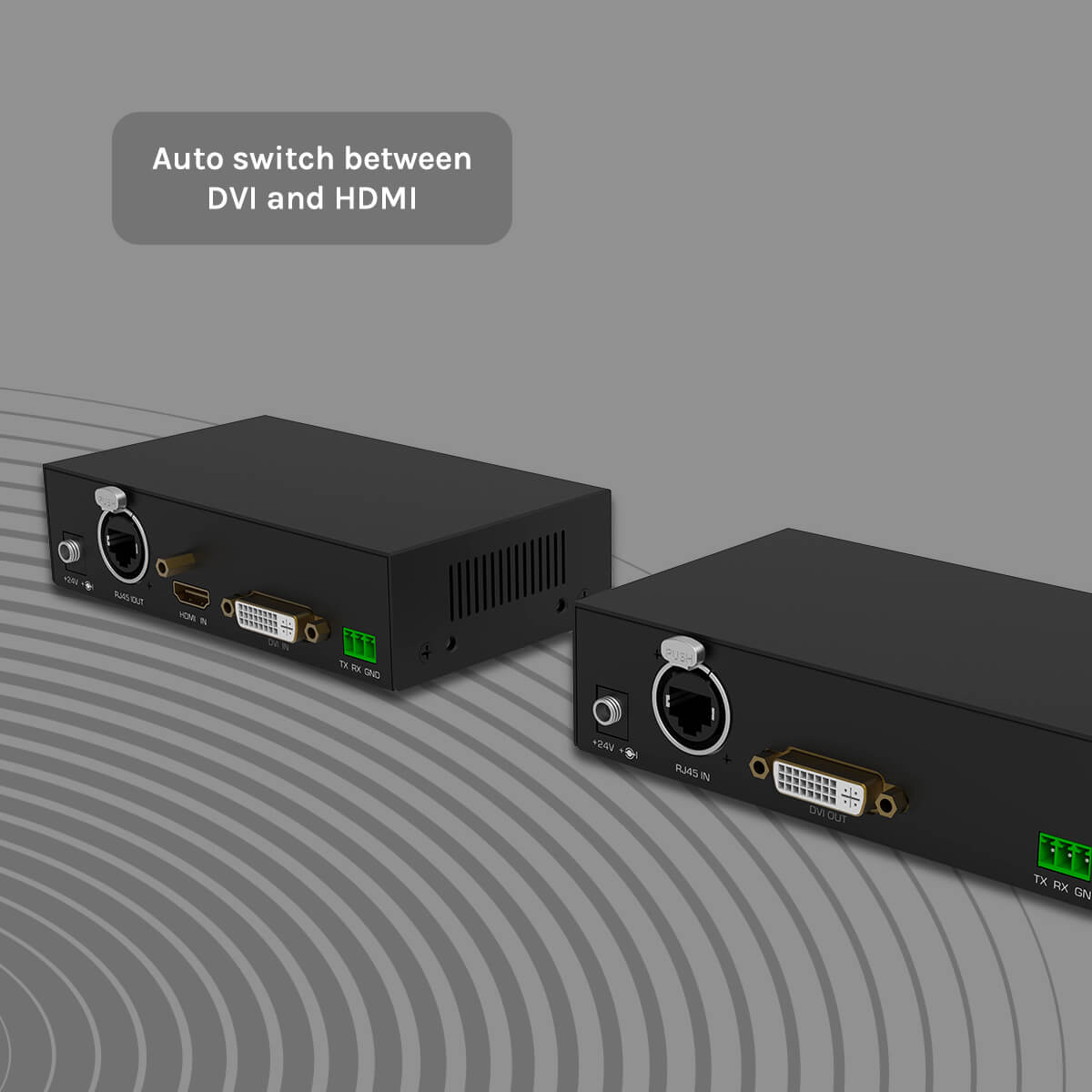 HDMI/DVI extension over Standard Neutrik RJ45 input / output interface. It supports one DVI, one HDMI signal input and input signal automatic identification The output supports DVI and supports EDID transmission. HDMI input lock, power lock. Support 24V single side power supply and POE power supply. Visible power status indicator, signal input status indicator, network connection status indicator, HDCP status indicator. Suitable for Rental and staging industry.